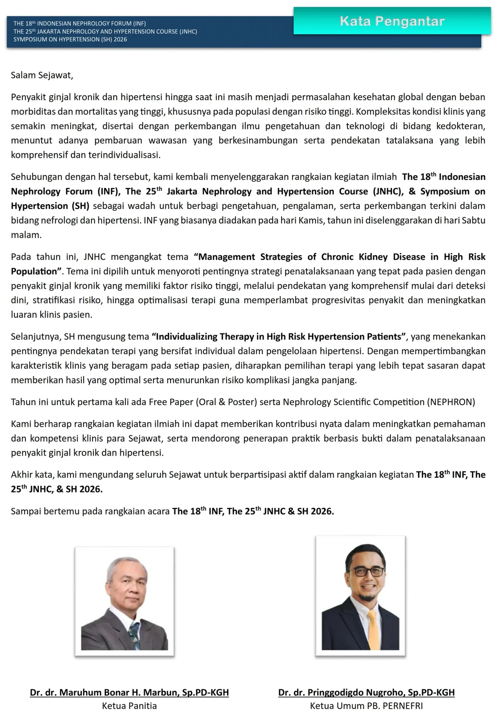 The 18th Indonesian Nephrology Forum, 25th Jakarta Nephrology and Hypertension Course & Symposium on Hypertension 2026 committee invites you to submit your abstracts of original research, systematic review/meta-analysis, or case report which are related to the main topic of the congress or nephrology and hypertension field.